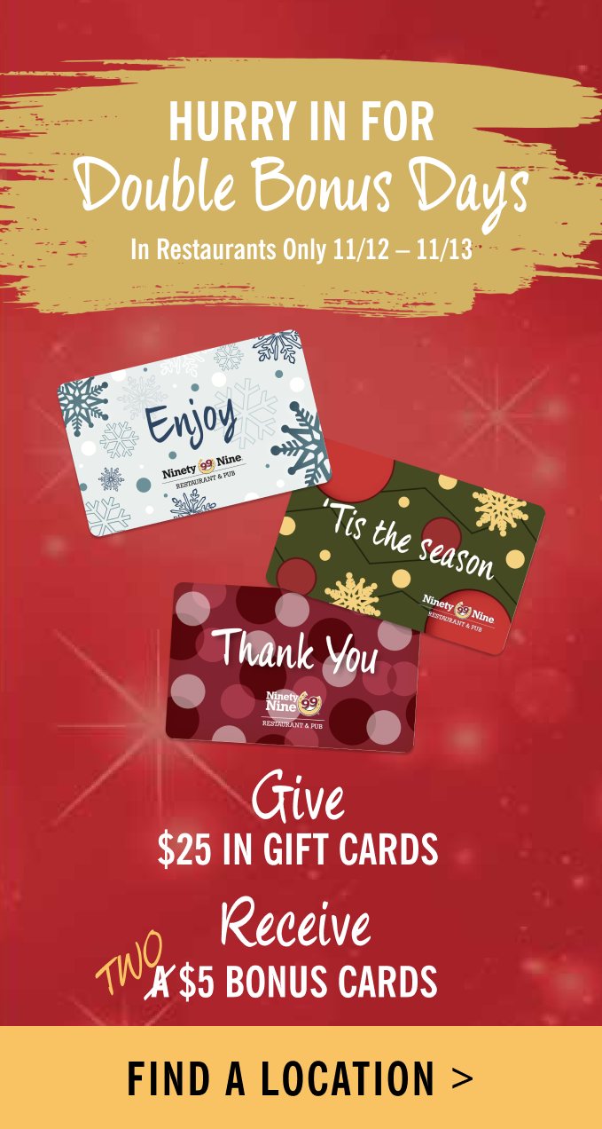 Ninety Nine Restaurant Coupon Code: Get Football Frenzy Dine-in and To ... Ninety Nine Restaurant Coupon Codes, Printable coupons, and Promo Codes Food, Beverage, & Restaurant Coupons 5 Coupon Codes Available 3 Online Coupons 2 Coupon Codes added this week New Coupon Ninety Nine Restaurant Ninety Nine Kids Menu. All entrees served with a free ice cream sandwich. Participating locations only. In-Store Only Expires: Ongoing Ninety Nine Restaurant Gift Card Promotion: Get $5 Bonus w/ $25 GC Purchase Ninety Nine Restaurant Gift Card Promotion. Buy Gift Card Now! Promotion: Get $5 Bonus w/ $25 GC Purchase. Expiration: June 16, 2019. Bonus card expires on 9/22/2019. Availability: Plastic gift card purchases only. Terms: $5 Bonus Cards ship with Gift Card to the same address. Not valid for alcoholic beverages or purchases of Gift Cards.